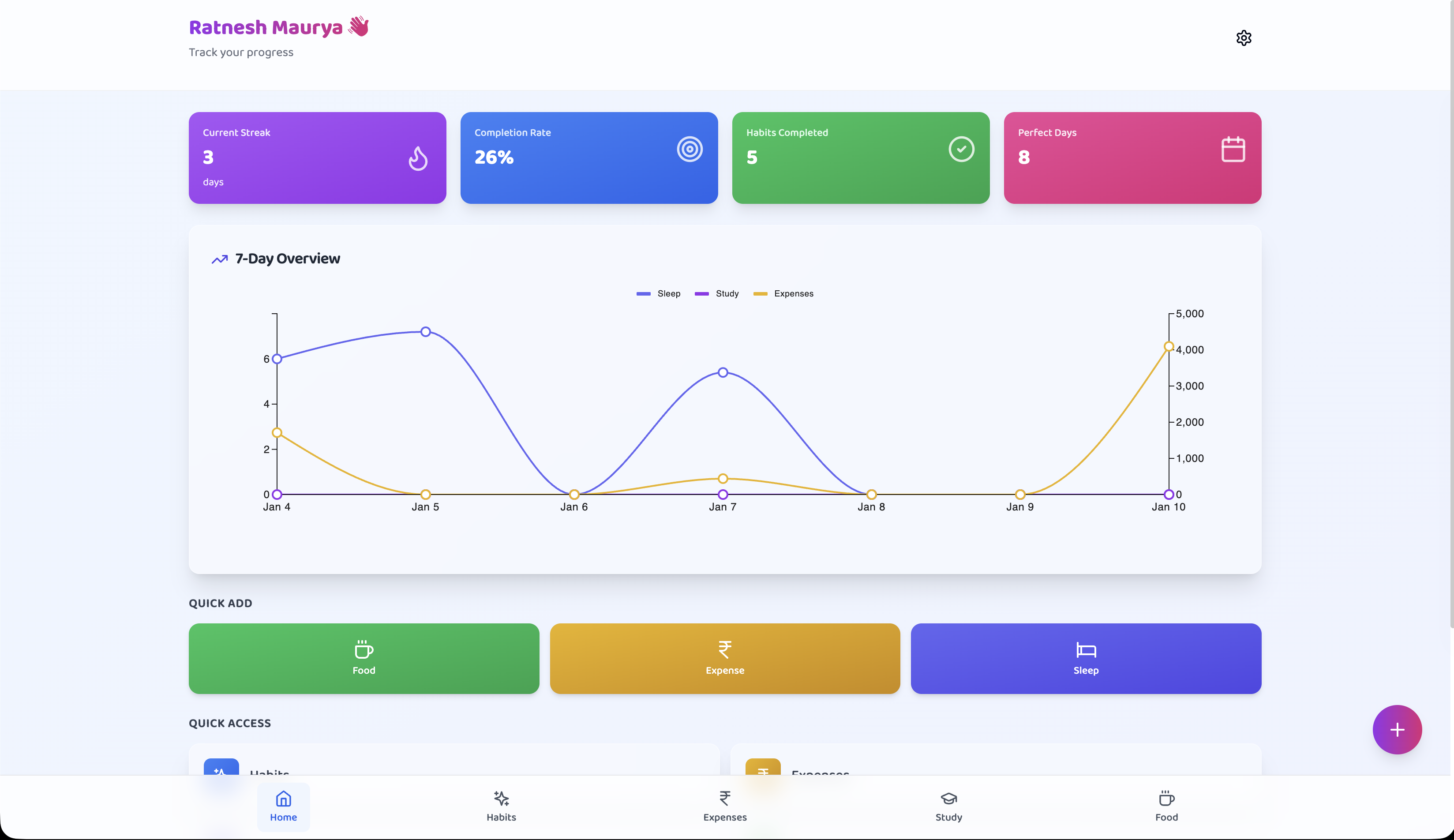 LiveA comprehensive personal tracker to build better habits. Tracks habits, expenses, sleep, and study time with interactive analytics dashboards powered by MUI X Charts. Built as a PWA so it works offline.